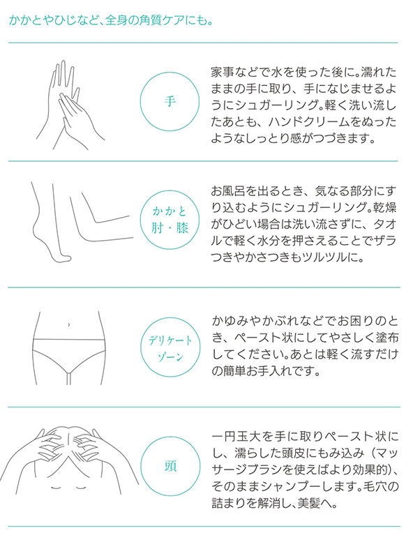 お砂糖の高い浸透力と高い吸水・ 保湿力により、お肌が水分をぐんぐん引き寄せるようになり、しっとりなめらかなお肌に仕上げます。