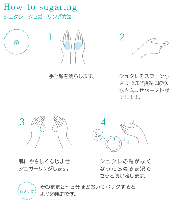 洗顔後の濡れたお肌になじませてサッと洗い流すだけの簡単ケアでお砂糖が
