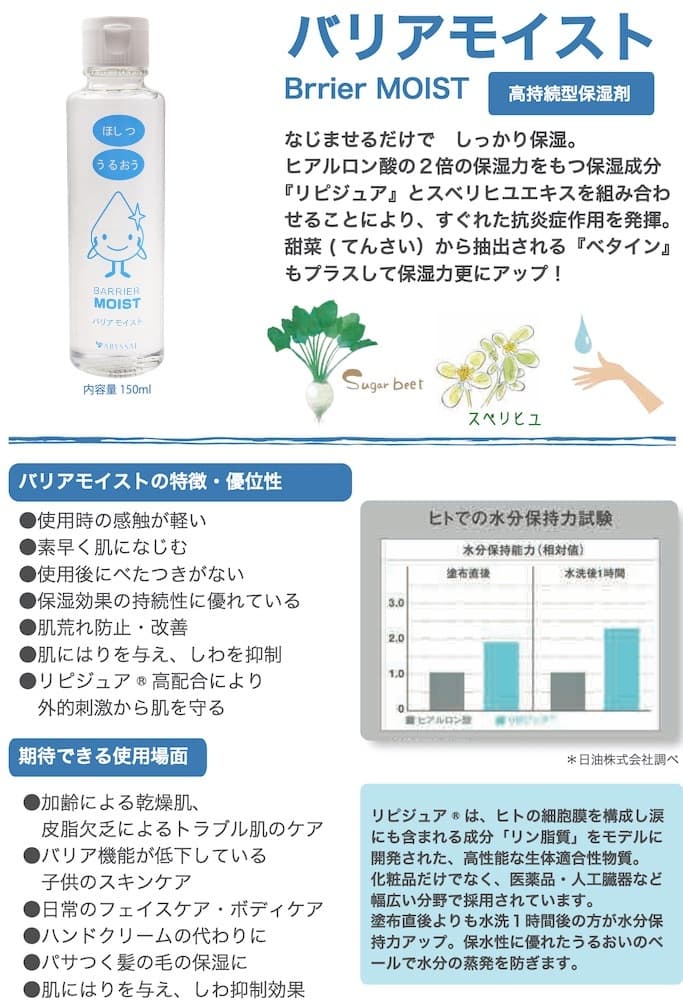 高持続型保湿剤。潤い膜で しっかり 高保湿。なじませるだけでしっかり保湿します。