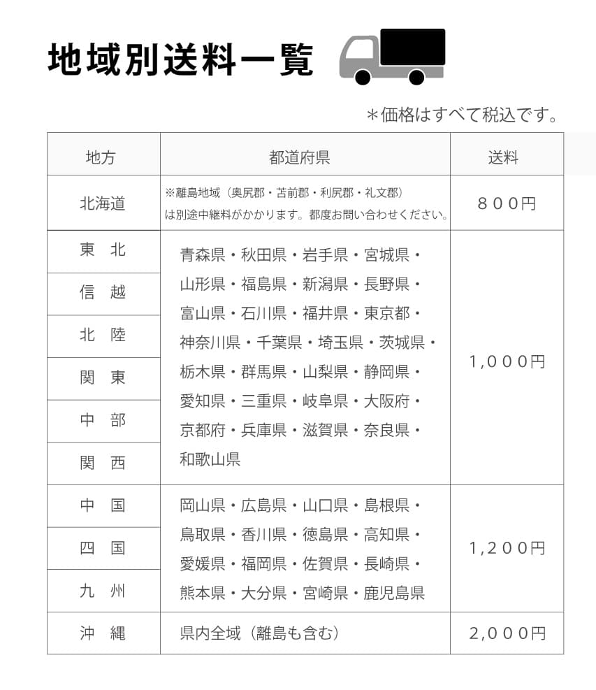 各地域ごとの送料となります。*「地域別送料一覧表」を参照