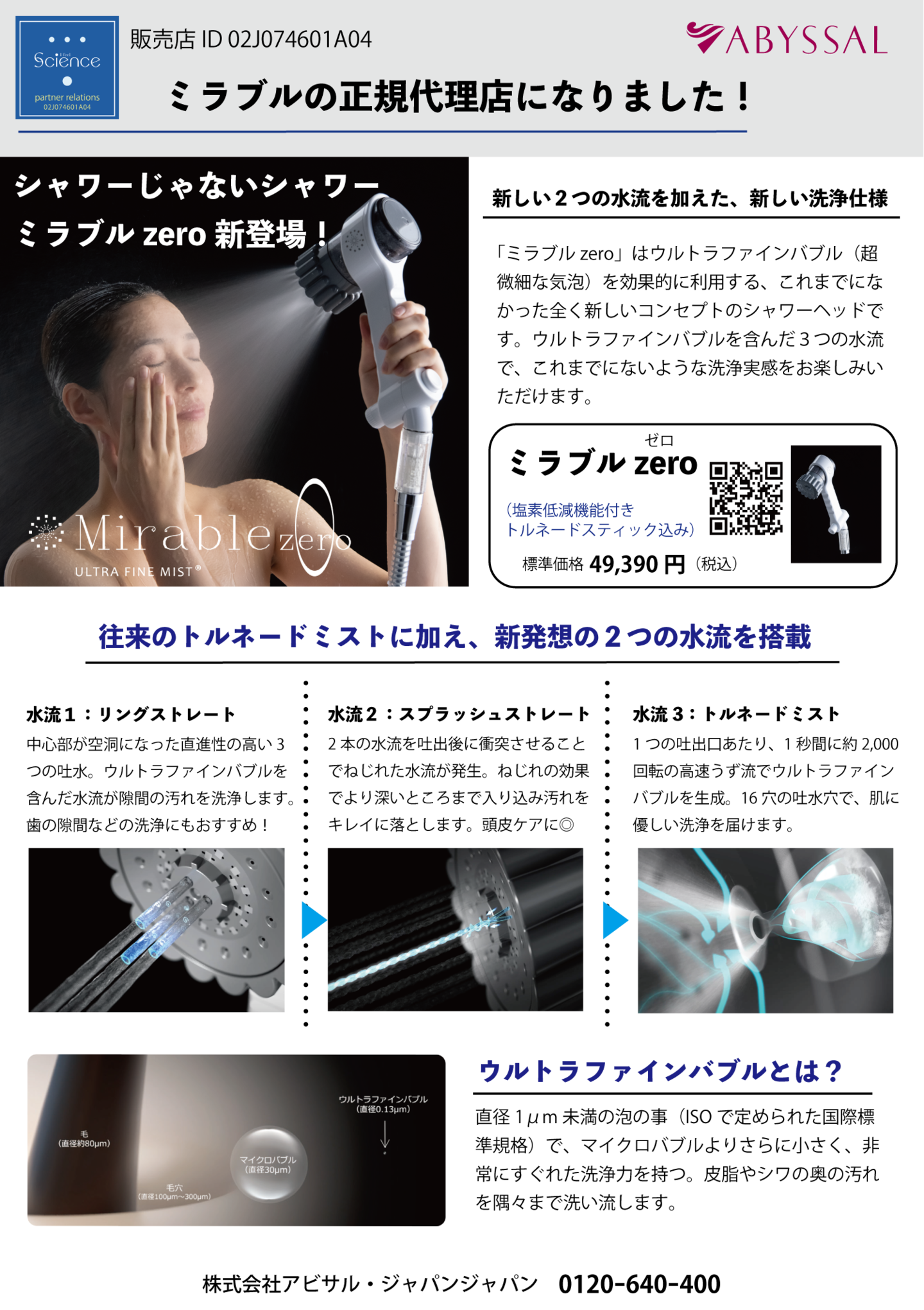 「ミラブルzero」はウルトラファインバブル(超微細な気泡)を効果的に利用する、これまでになかった全く新しいコンセプトのシャワーヘッドです。ウルトラファインバブルを含んだ3つの水流で、これまでにないような洗浄実感をお楽しみいただけます。