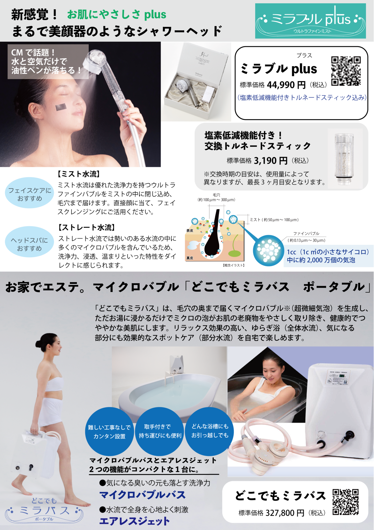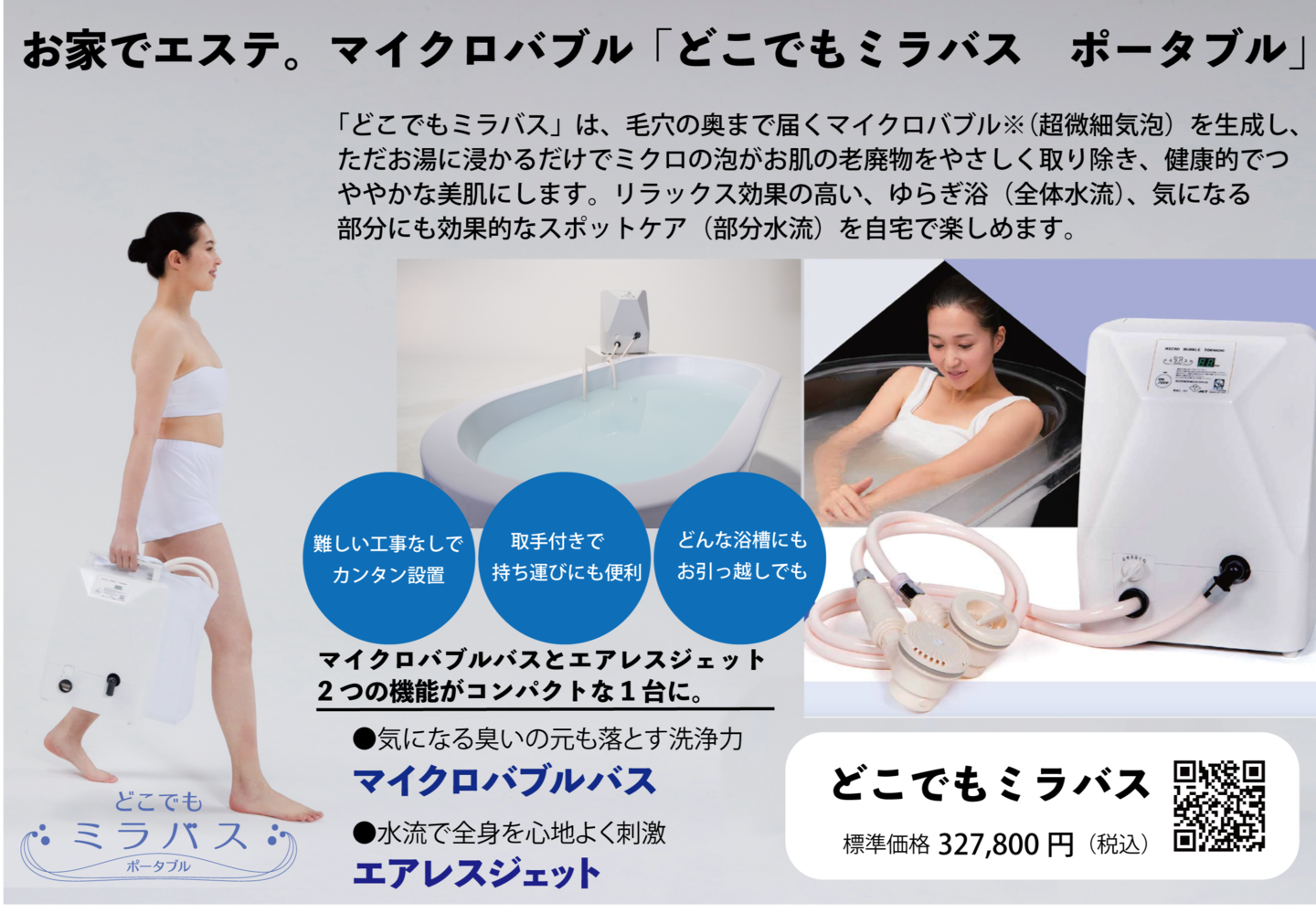 「どこでもミラバス」は、毛穴の奥まで届くマイクロバブル※(超微細気泡)を生成し、ただお湯に浸かるだけでミクロの泡がお肌の老廃物をやさしく取り除き、健康的でつややかな美肌にします。リラックス効果の高い、ゆらぎ浴(全体水流)、気になる部分にも効果的なスポットケア(部分水流)を自宅で楽しめます。