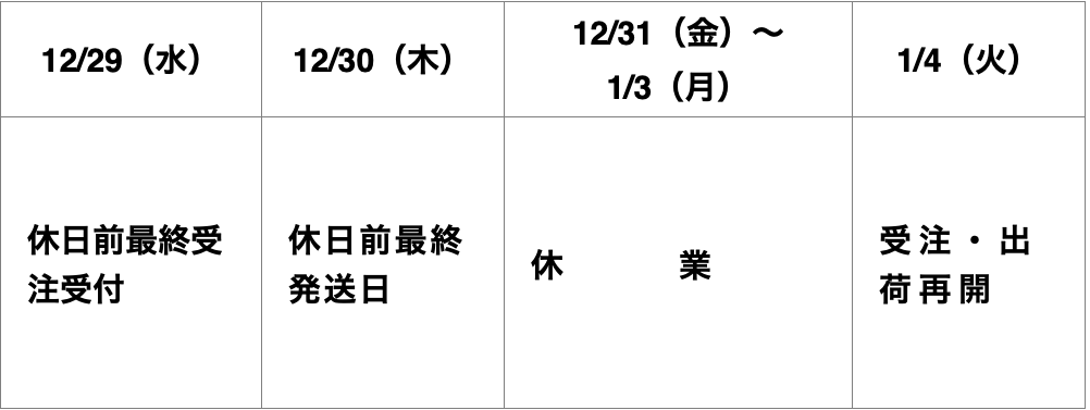 年末年始における商品発送スケジュールを下記のとおりご案内させて頂きます。