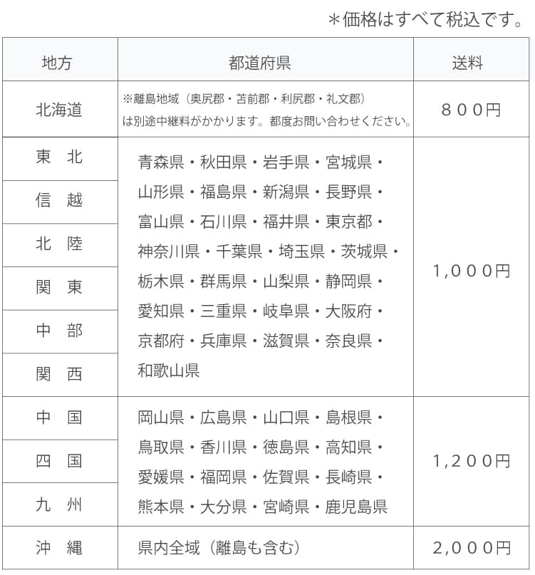 地域別の送料につきましては、下記ご参照ください。