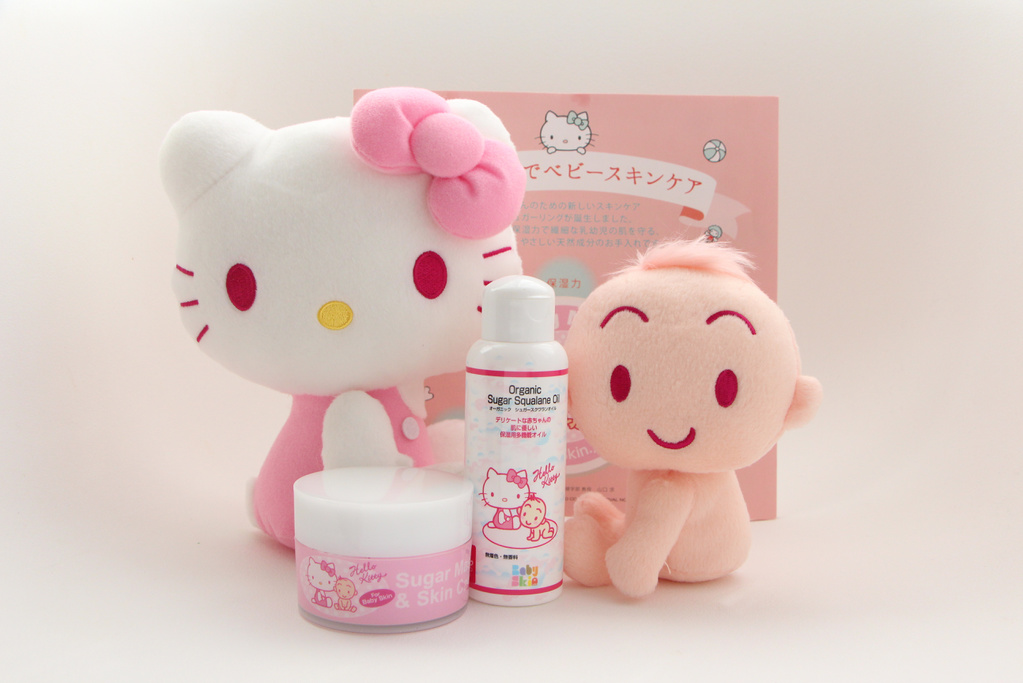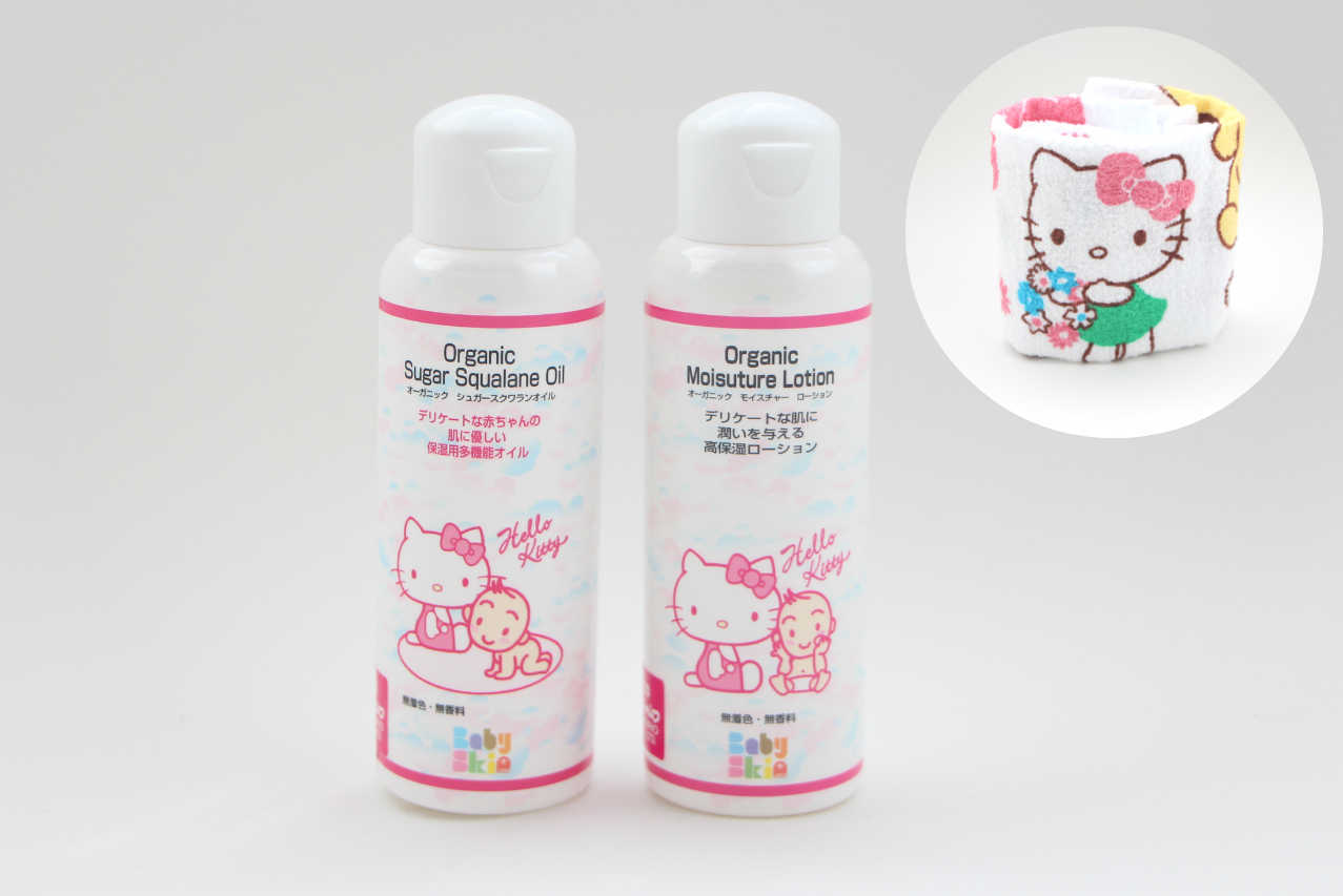 ベビー用のスキンケアアイテムに、ハローキティのタオルをプレゼント。ご出産祝いにおすすめです。