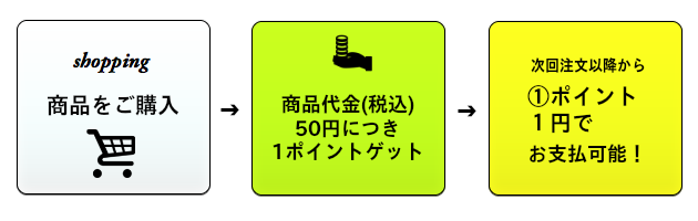 ポイントはお買上げ金額50円(税込)につき1ポイント付与され、貯まったお買物ポイントは1ポイント1円としてご利用頂けます。