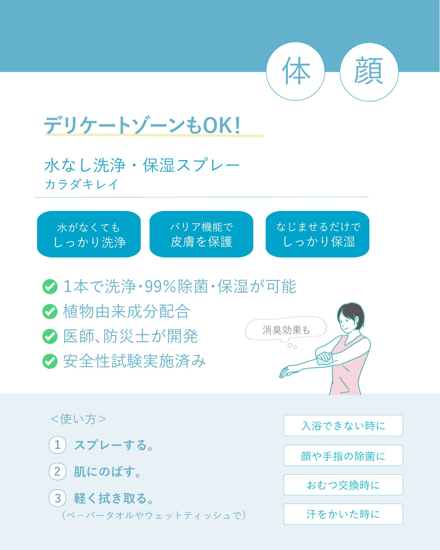 『カラダキレイ』は、肌やデリケートゾーンのケアに使用され、トウモロコシとココナツ由来のアミノ酸、甜菜糖を含んだ優しい成分で開発されています。水を必要とせず、肌にスプレーして軽くふき取るだけで清潔な肌を保つことが可能です。
