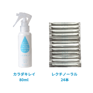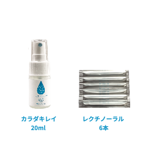 「安心防災衛生セット」には、洗浄保湿ローション『カラダキレイ』と、口腔ケア商品『レクチノーラル』が含まれています。これらのアイテムは水を必要とせず、肌や口腔を清潔に保つため、被災時でも安心して使用できます。