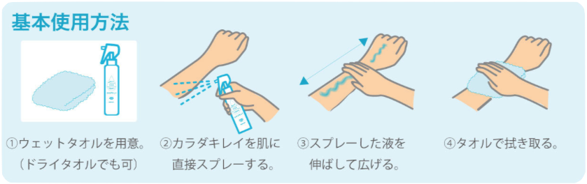そこでオススメなのが肌にスプレーしてふき取るだけで汚れが落とせる洗浄型保湿ローション「カラダキレイ」。