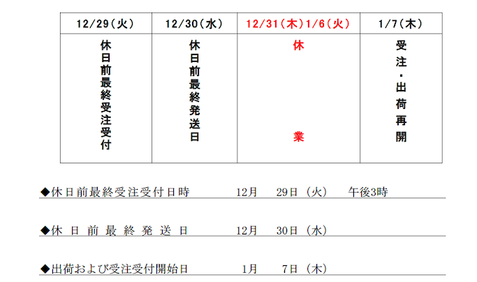 年末年始における商品発送スケジュールを下記のとおりご案内させて頂きます。