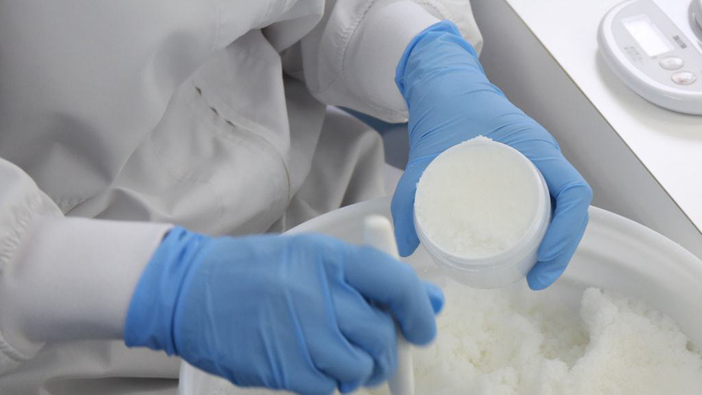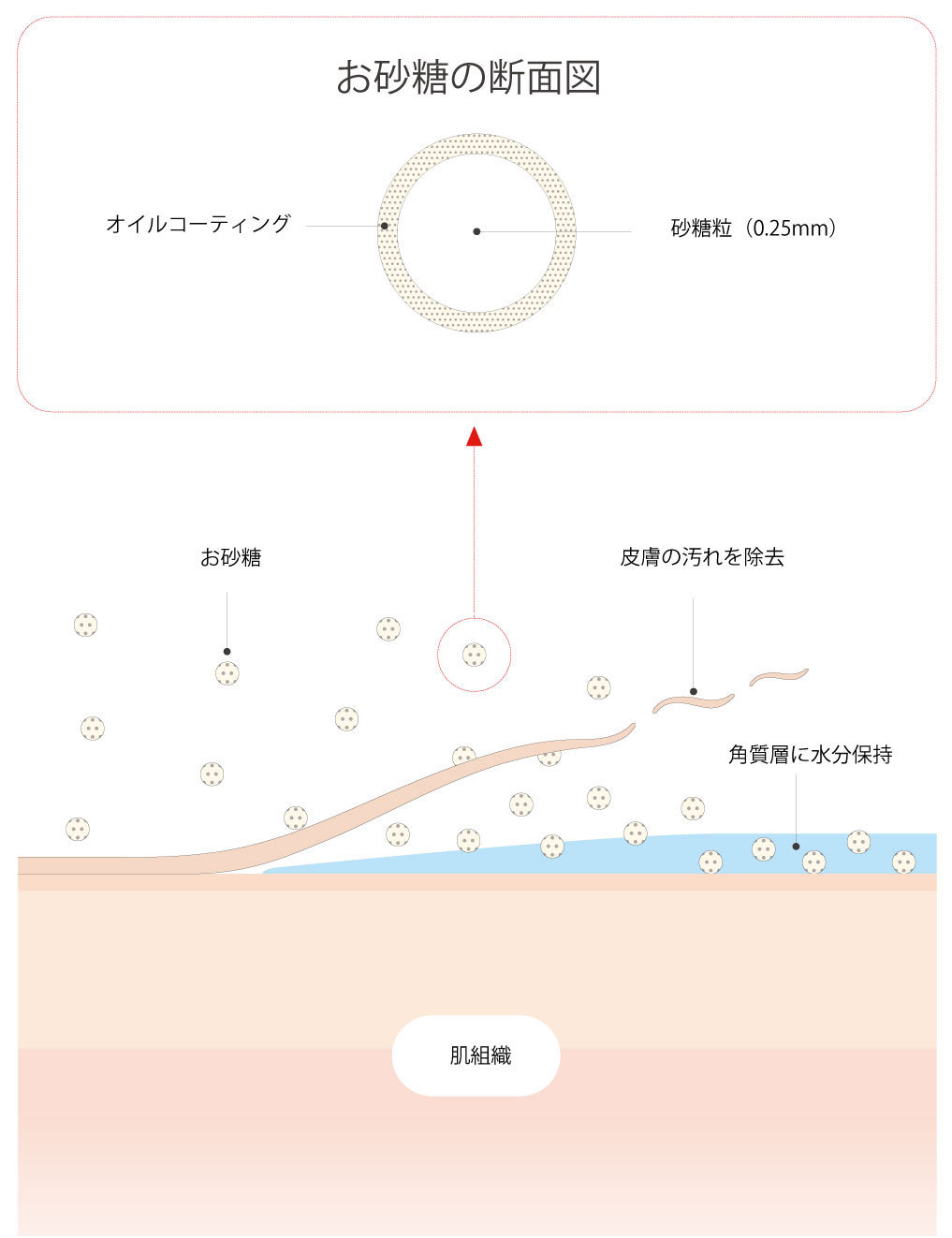 肌に触れたときの刺激を解消するために、砂糖の粒を0.25mm以下の微細な粒子に整え、独自の技術で製造しています。このため肌ざわりがなめらかで、少しの水分を含ませると、すぅっと粒が溶けていきます。